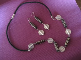 Conjunto de collar y pendientes de cordón con abalorios de hueso y piezas de matel plateado